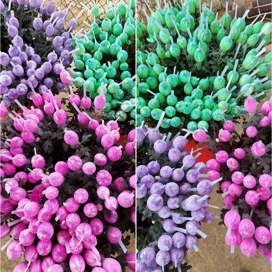 (Màu nhuộm hoa tươi bên trái nhạt hơn do chưa đủ thời gian và chợ sỉ hoa chỉ có nhu cầu màu nhạt)