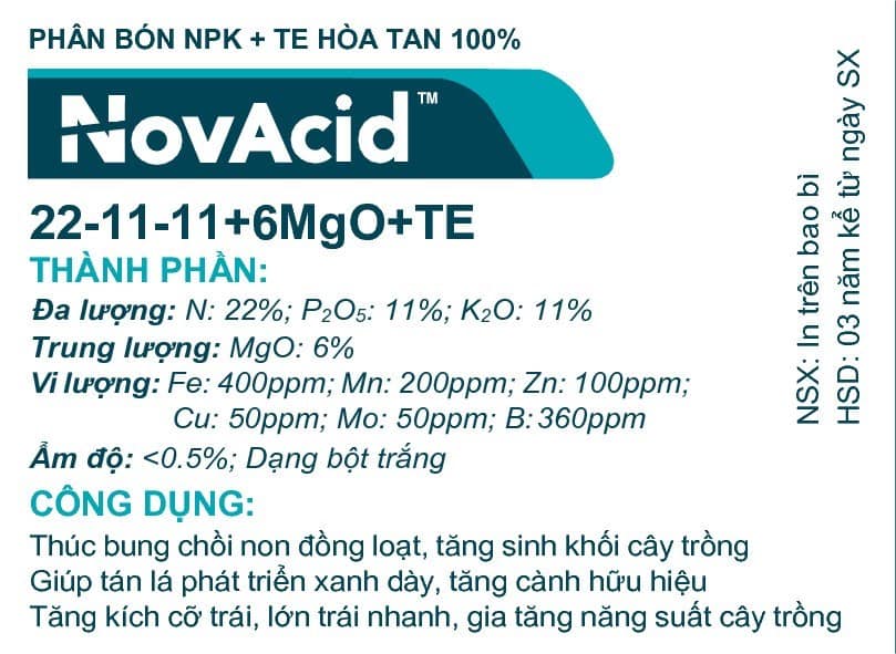 Phân bón lá NPK Novacid 22-11-11+6MgO dùng bón phân cho CÂY TRỒNG GIÚP Thúc bung chồi non đồng loạt, tăng kích cở trái vào giai đoạn phát triển cây trồng thông qua hệ thống tưới nhỏ giọt hay bón gốc để hấp thu tốt hơn
