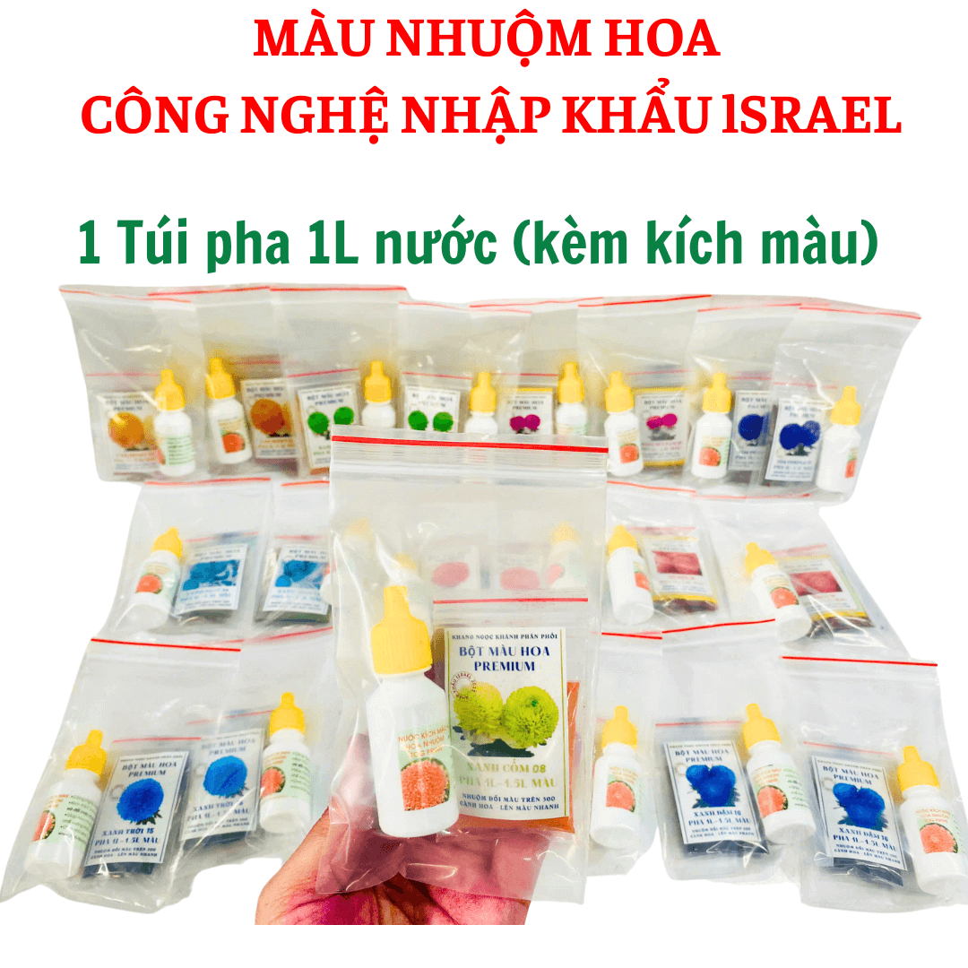 + Một gói thuốc bột nhuộm màu hoa trọng lượng (6-12gr tuỳ màu) chuẩn pha 1L nước màu hoa + Tặng thêm Chai kích màu Prime 10ml pha chung với bột ở trên để giúp hoa hút nước màu nhanh hơn và đều màu hoa, bạn đã có ngay dung dịch nhuộm hoa chuẩn chuyên nghiệp.