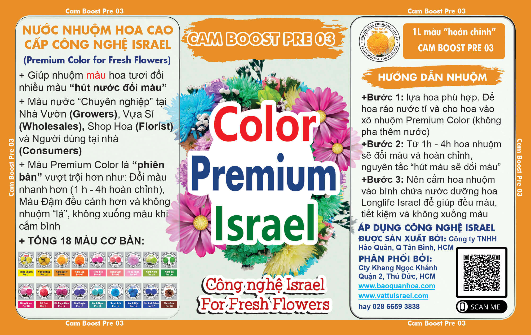 – Cam Boost là màu nhuộm hoa cao cấp dành cho người làm hoa chuyên nghiệp, được nhập khẩu từ nguồn nguyên liệu an toàn, không độc hại, thân thiện với môi trường và sức khỏe người dùng.