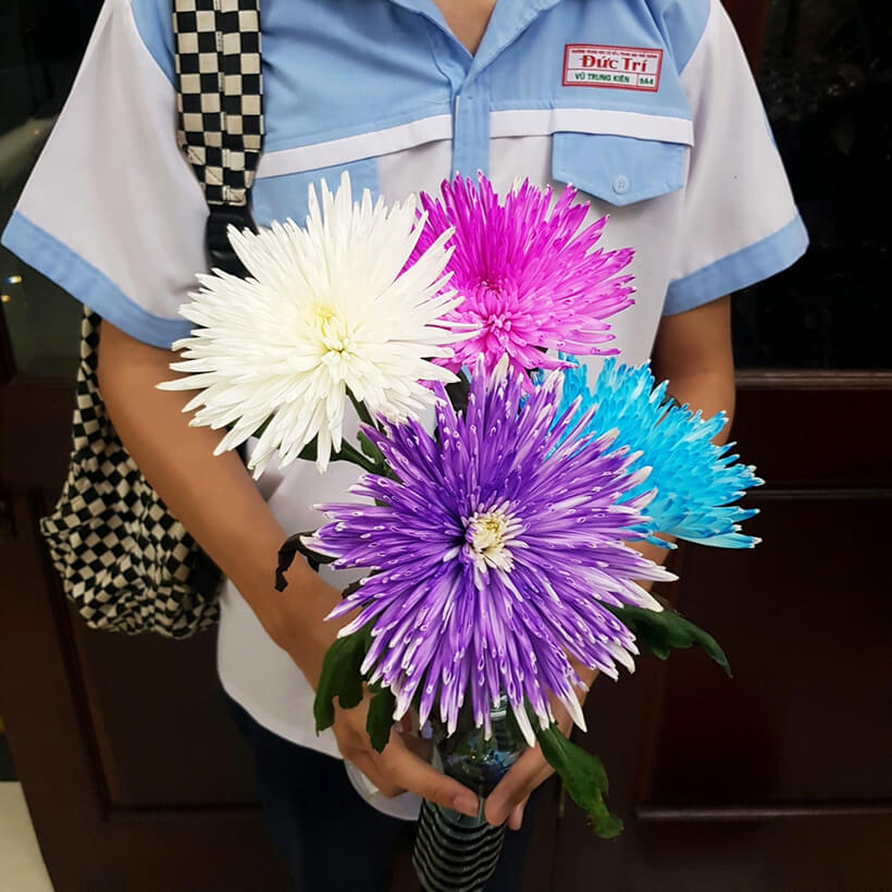 – Cho hoa vào nước màu nhuộm (từ chân gốc lên 3 – 5cm và đợi thay đổi màu trên hoa).