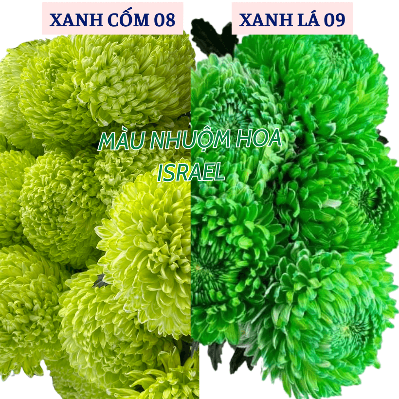 100% là khác nhau. Như hình bên dưới là sự khác nhau của hoa cúc nhuộm màu xanh Lá pre 09 và hoa cúc nhuộm màu xanh cốm Pre 08. Theo đó, Trong Thuốc Bột màu hoa xanh cốm có Màu Xanh Lá và Vàng Chanh Pre tạo thành. Nếu bạn muốn màu xanh lá sáng màu hơn, ít đậm hơn thì nên pha thêm thuốc nước nhuộm hoa tươi màu vàng nhé