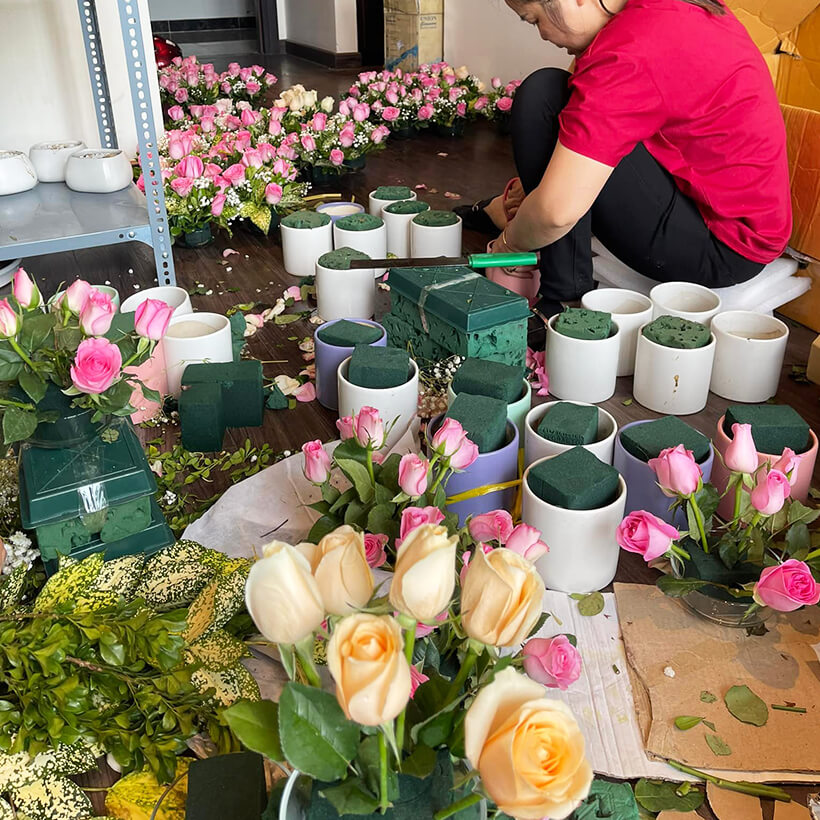 – Nếu là hoa cắm Xốp hay MUD hoa: Ngoài xử lý hoa trong nước cắm hoa (ít nhất 4h) + Nhúng Xốp hoa vào thuốc cho thấm ướt. Sau cùng trang trí Hoa vào Xốp (đều có xử lý thuốc dưỡng hoa rồi)
